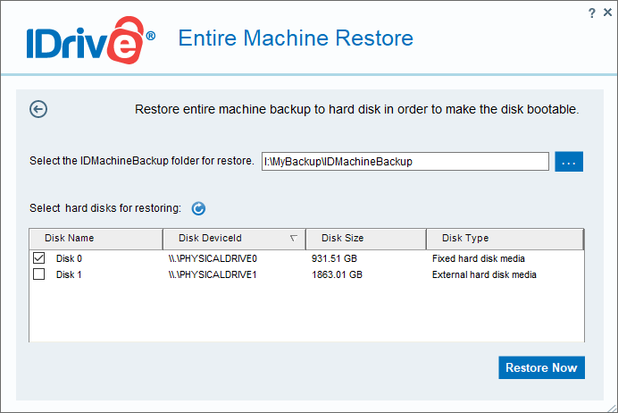 4. Click . Navigate and select the entire machine backup folder (IDMachineBackup), pre-downloaded from your IDrive cloud backup account or local backup for restore.